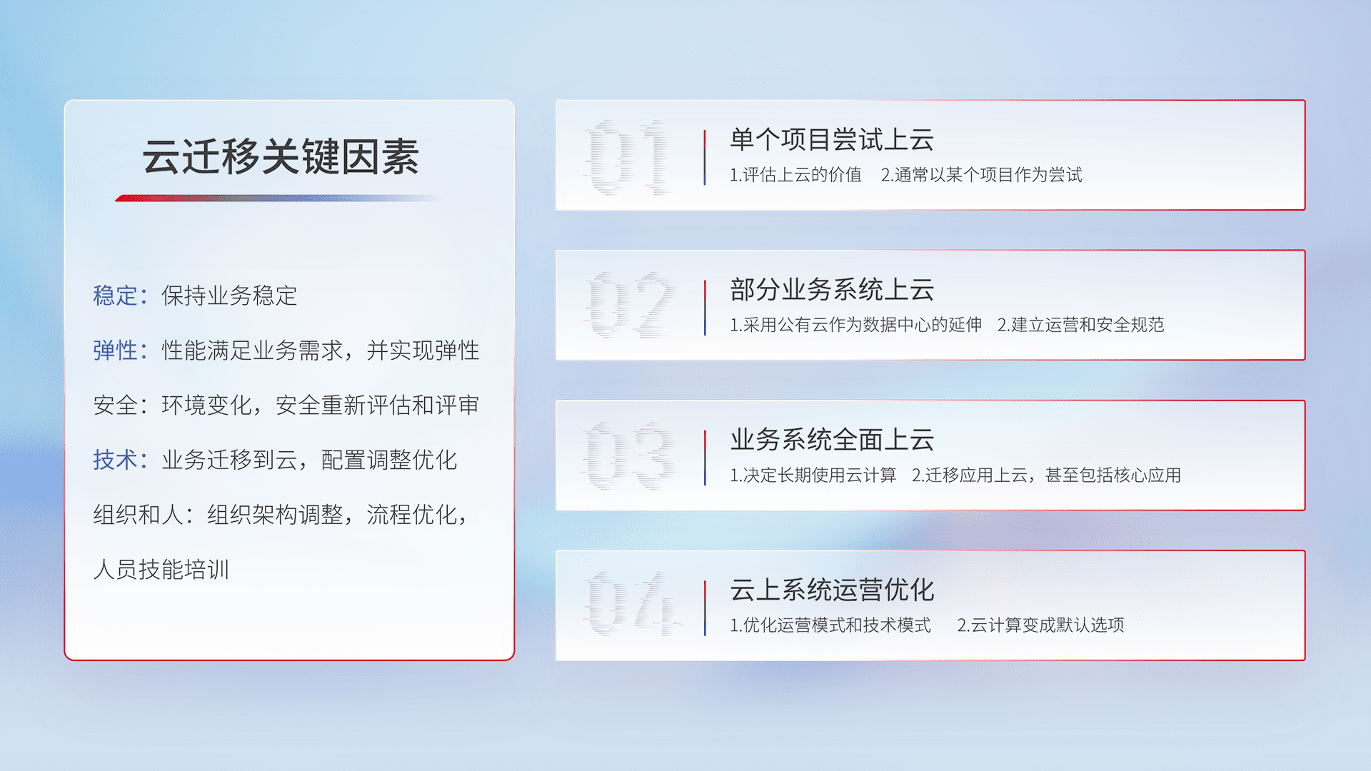 结合实际业务,,,,从规划设计、、云平台选型、、、、云原生改造、、、、数据迁移、、、、集成交付,,,,迁移全过程为客户识别最佳上云路径,,,,做好风险识别管理,,设计网络架构、、身份权限、、安全审计合规、、操作审计、、、日志审计、、监控告警策略、、多站点容灾设计等,,对云上基础设施进行整体规划,,提升IT治理水平,,,以满足弹性、、、、高可用、、高性能的需求。。