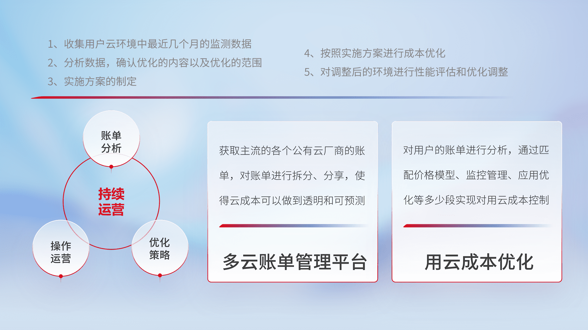 通过多云纳管,,,以统一的资源数据模型把客户的云资源进行抽象和封装,,,进而实现对多云资源的统一操作,,,保障云资源管理的可靠性、、、、稳定性与可用性。。量身定制化运维内容,,,,配置、、开发运维、、、补丁管理、、备份、、监控、、、认证和访问管理、、、、审计和日常巡检等,,保障在用云过程中的可靠度,,,,稳定度以及高可用率。。。。